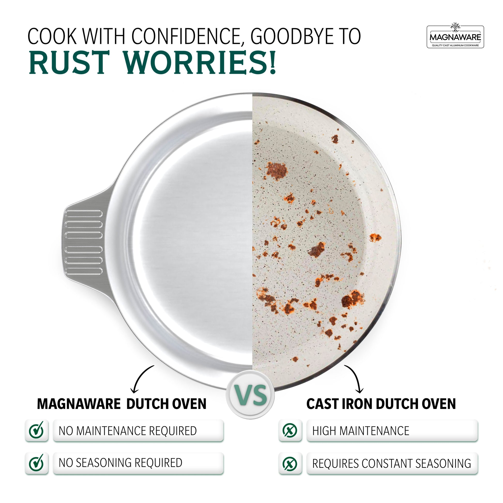 - Your New Trusty Kitchen Companion - Make cooking a breeze with Magnaware lightweight, rustproof aluminum Dutch oven pot with lid! Comes complete with a silicone covers for the handles, our cookware allows for an easy and secure grip.