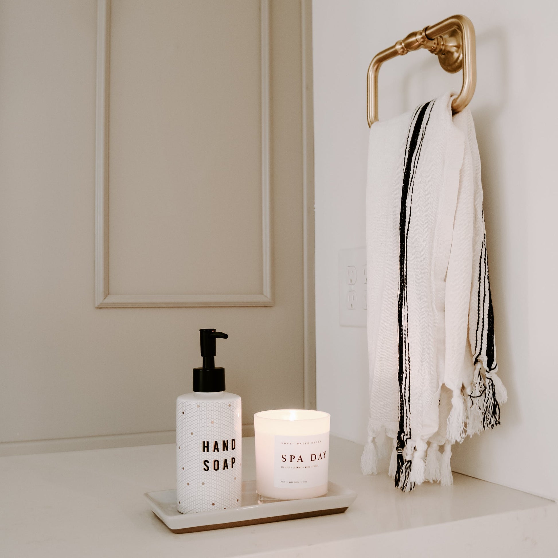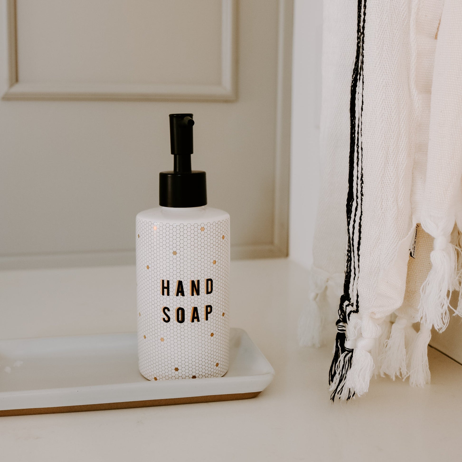 Our whimsical and boho-inspired gold tile hand soap dispensers will upgrade your bathroom or kitchen sink area. We love these for how ecofriendly they are, while at the same time being functional and beautiful. Our refillable hand soap dispensers can be filled with your favorite hand soap over and over again to reduce plastic use while giving your space a stylish update!