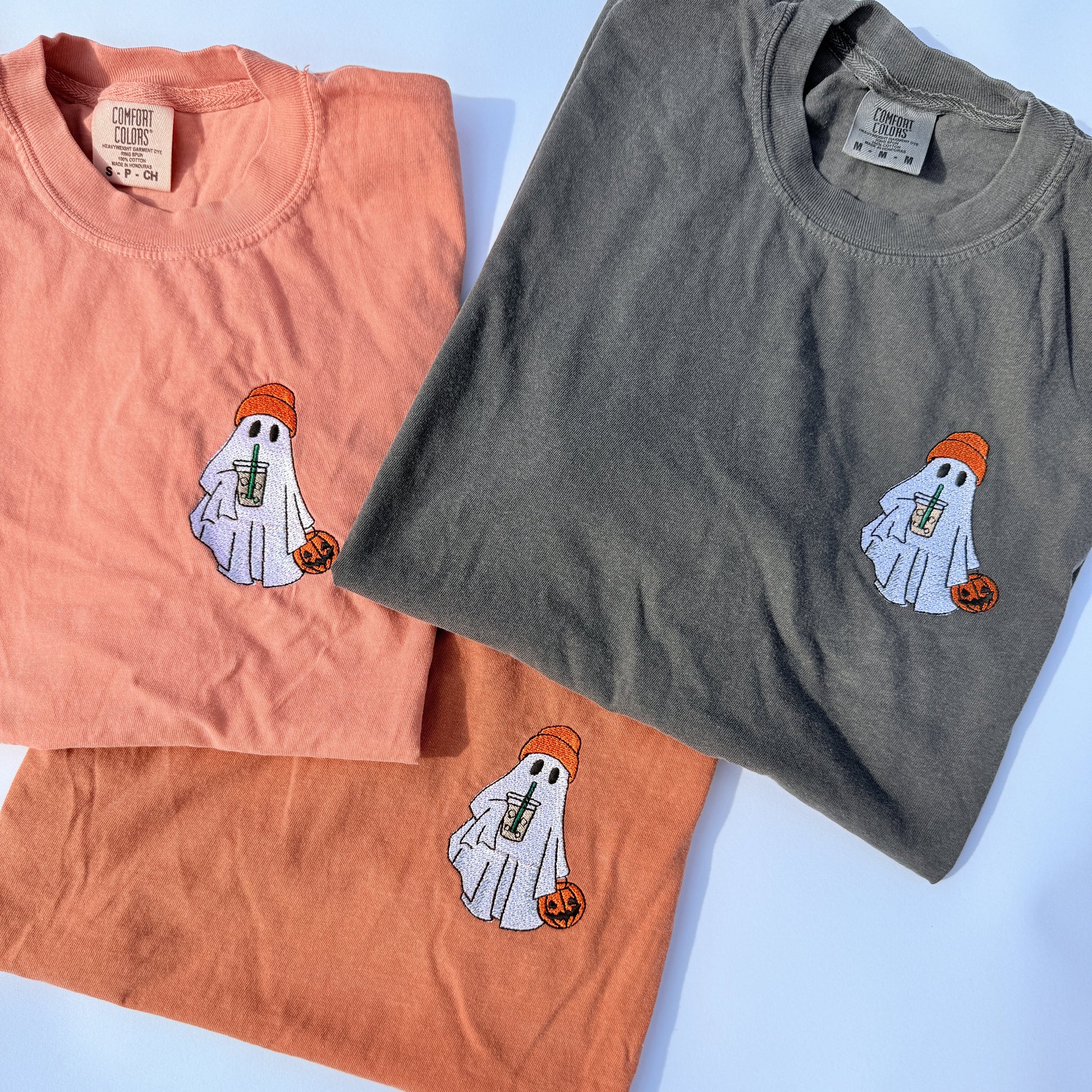 Adult Embroidered Iced Coffee Ghost Comfort Colors Tee - more colors