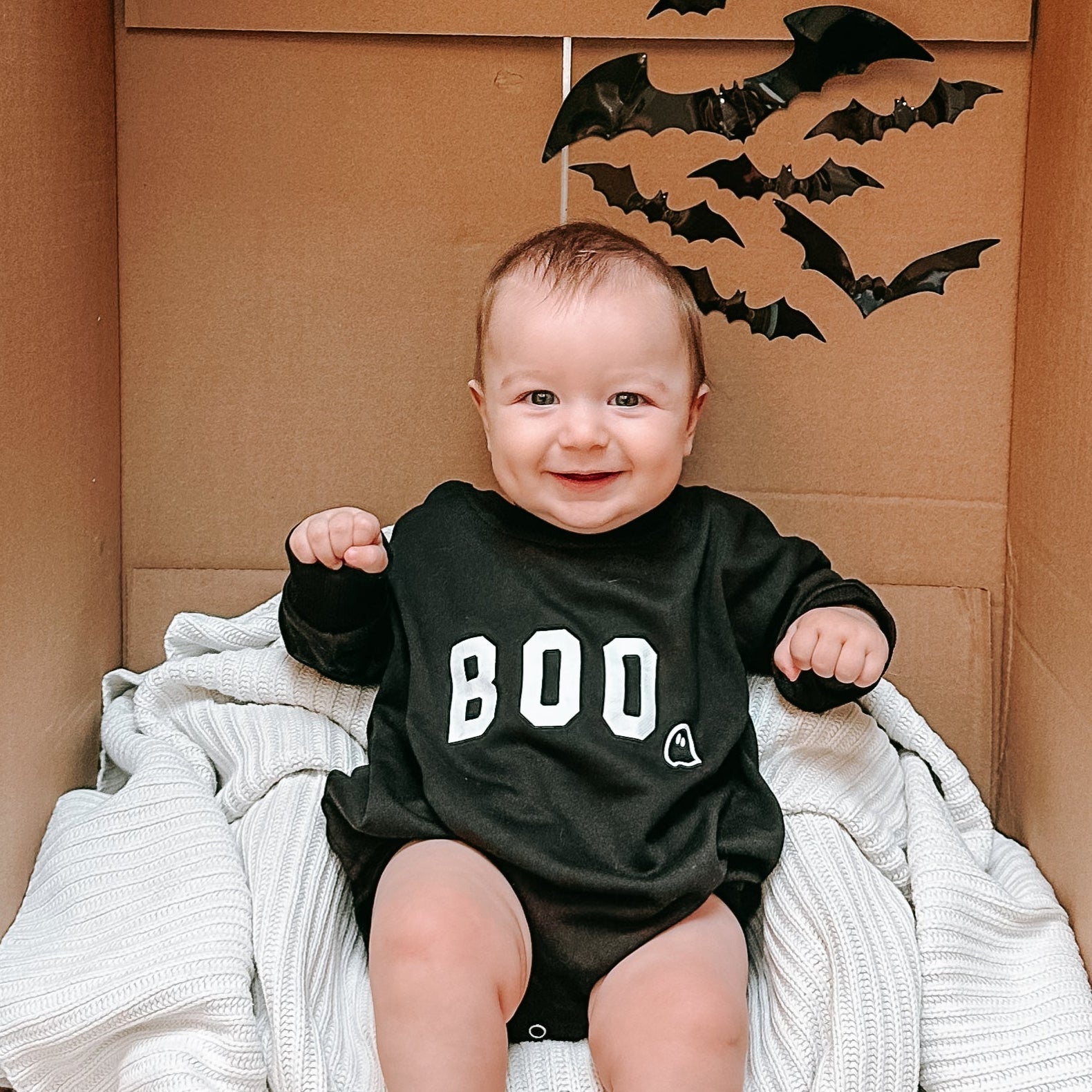 BOO Graphic Oversized Sweatshirt Romper - Embrace spooky vibes with this cozy and stylish oversized sweatshirt romper. Featuring a convenient snap closure at the crotch, it guarantees easy dressing and diaper changes. Made from a high-quality French terry material consisting of 83% cotton and 17% polyester, it offers comfort and versatility. The charming Halloween themed design is screenprinted, ensuring a durable and vibrant look without the risk of lifting or peeling. Get ready to welcome Halloween in comfort and style!