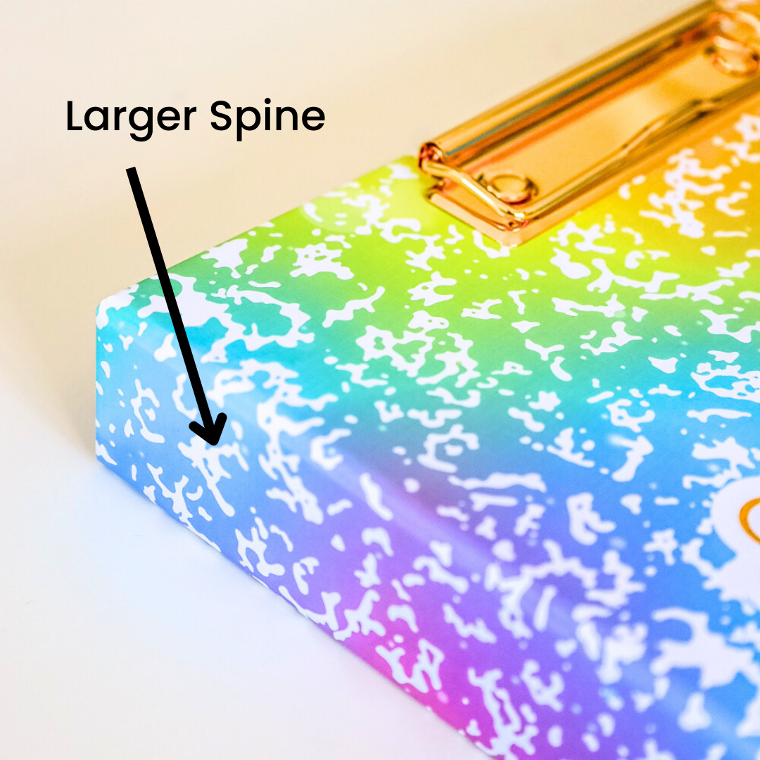 This stylish and functional Clipfolio features a vibrant retro-inspired design that blends nostalgia with modern flair. The eye-catching rainbow-colored composition notebook pattern adds a playful yet professional touch, making it perfect for teachers, students, and anyone who loves a pop of color in their organization tools.