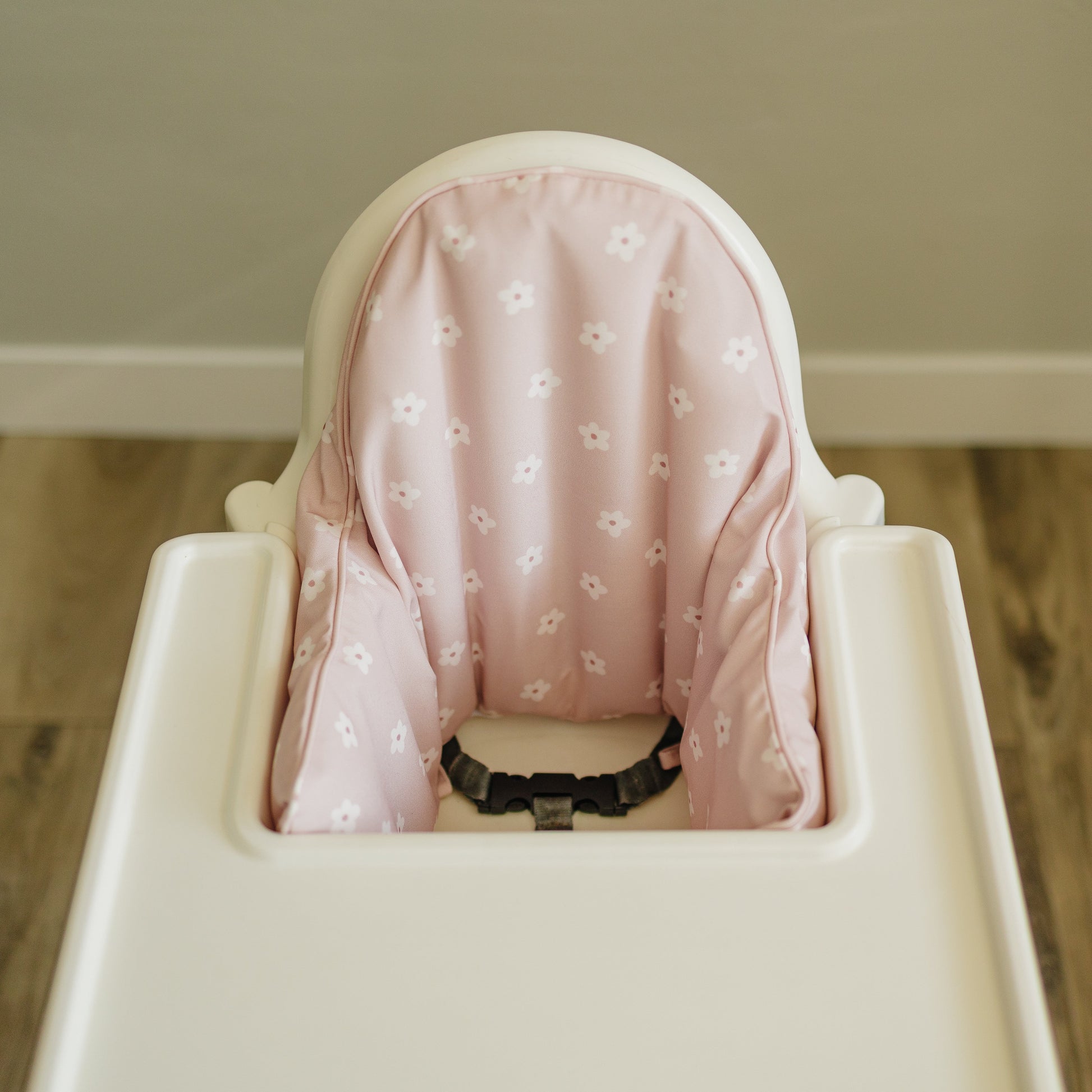 White Flowers on a pink background! Wipeable cushion cover for the IKEA Antilop Highchair