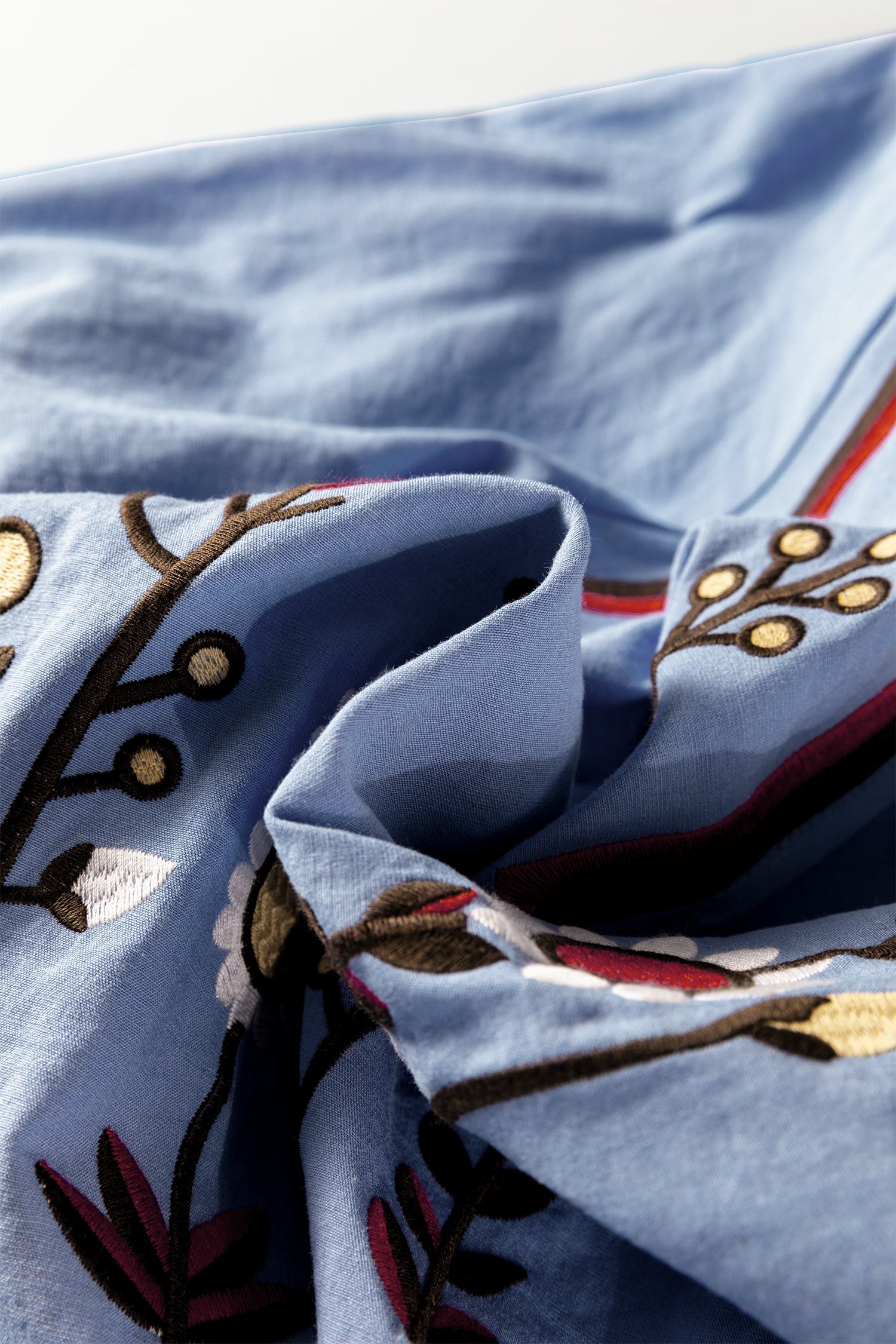 Embrace effortless bohemian style with this enchanting blouse featuring delicate embroidery that brings botanical beauty to life. The split neck design lets you customize your look with adjustable styling, while tassel tie detailing adds a playful touch of movement. Romantic sleeves deliver fashion-forward volume that makes a statement without trying too hard. Perfect for those who love mixing elegance with carefree, whimsical charm. Cotton/Viscose/Poly