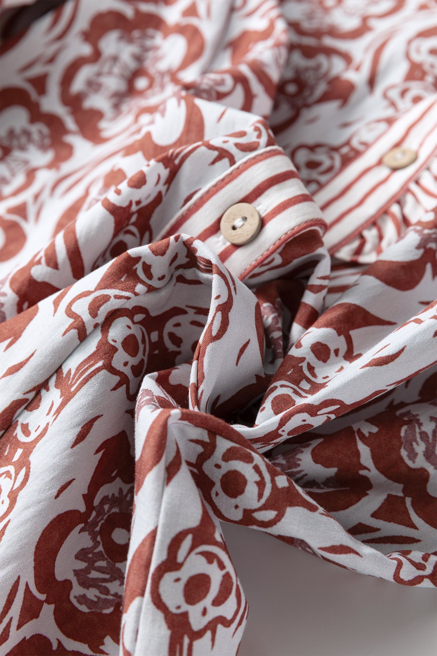 Effortless charm meets refined detail in this floral shirt. A striped contrast ruffle neckband adds a playful touch of sophistication, while smocked cuffs bring texture and shape to the puffy long sleeves. Whether you're layering it up or going solo, this versatile piece transitions beautifully through every season, making it an instant wardrobe favorite that works as hard as you do. 100% Cotton