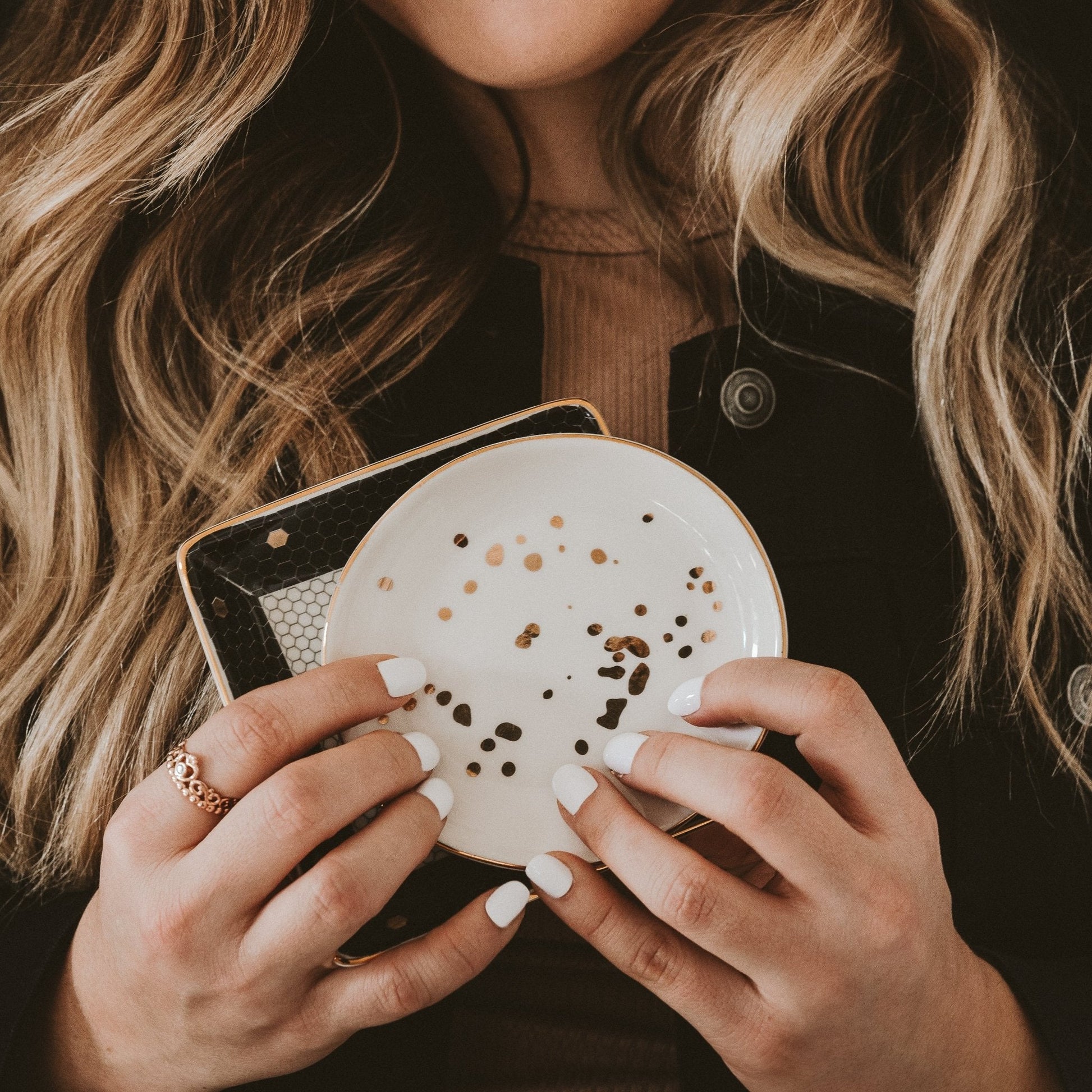 Organize your jewelry in style with our White Gold Speckled Jewelry Dish. This beautiful white trinket tray is the perfect addition to any room in your home. The gold foil details add a touch of chic glam, making it easy to dress up any space!