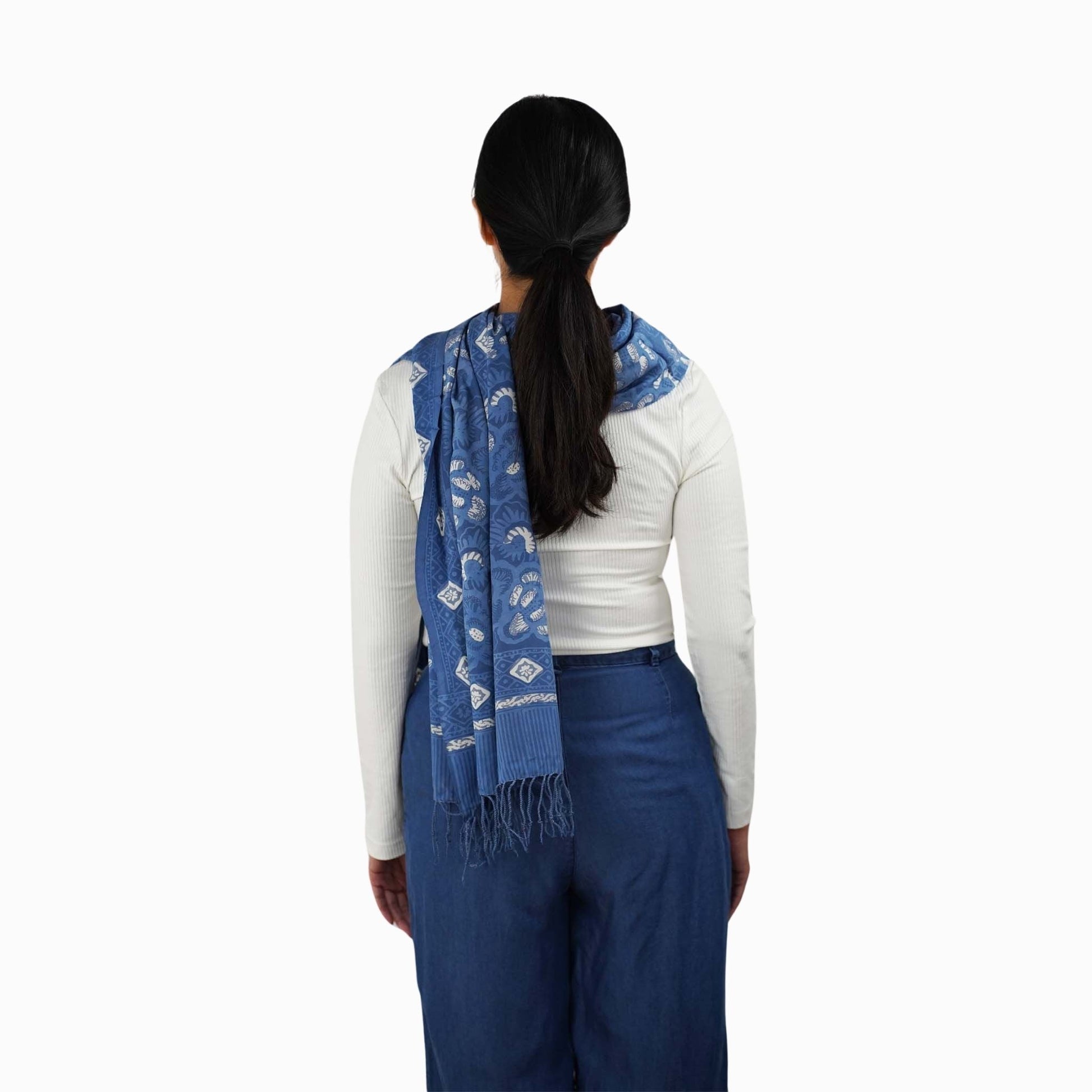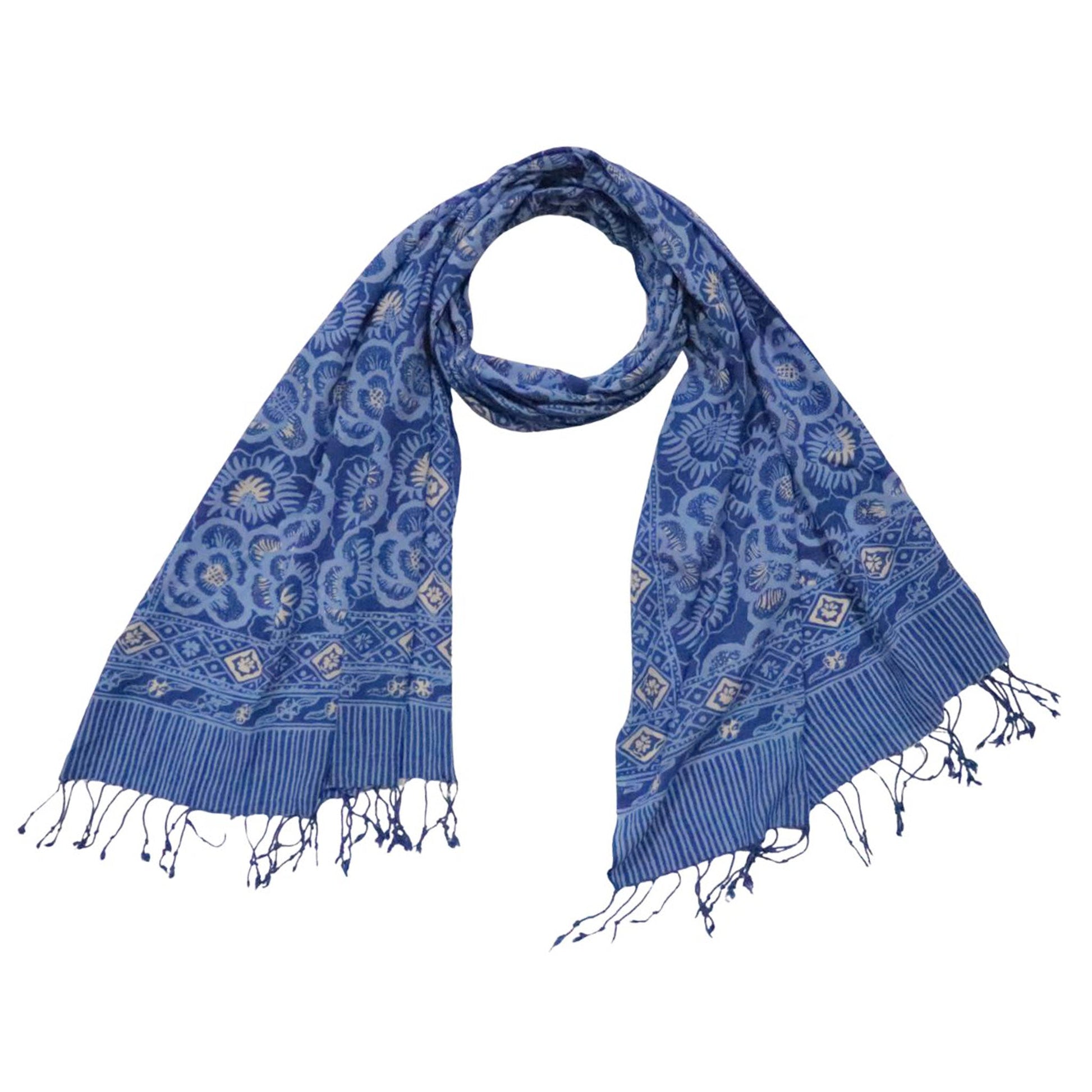 - This scarf is made from white cotton fabric that is then hand-stamped and hand-dyed using 700 years old batik wax and dye technique. The batik fabric is also then sun baked. You should expect some variation of the color.