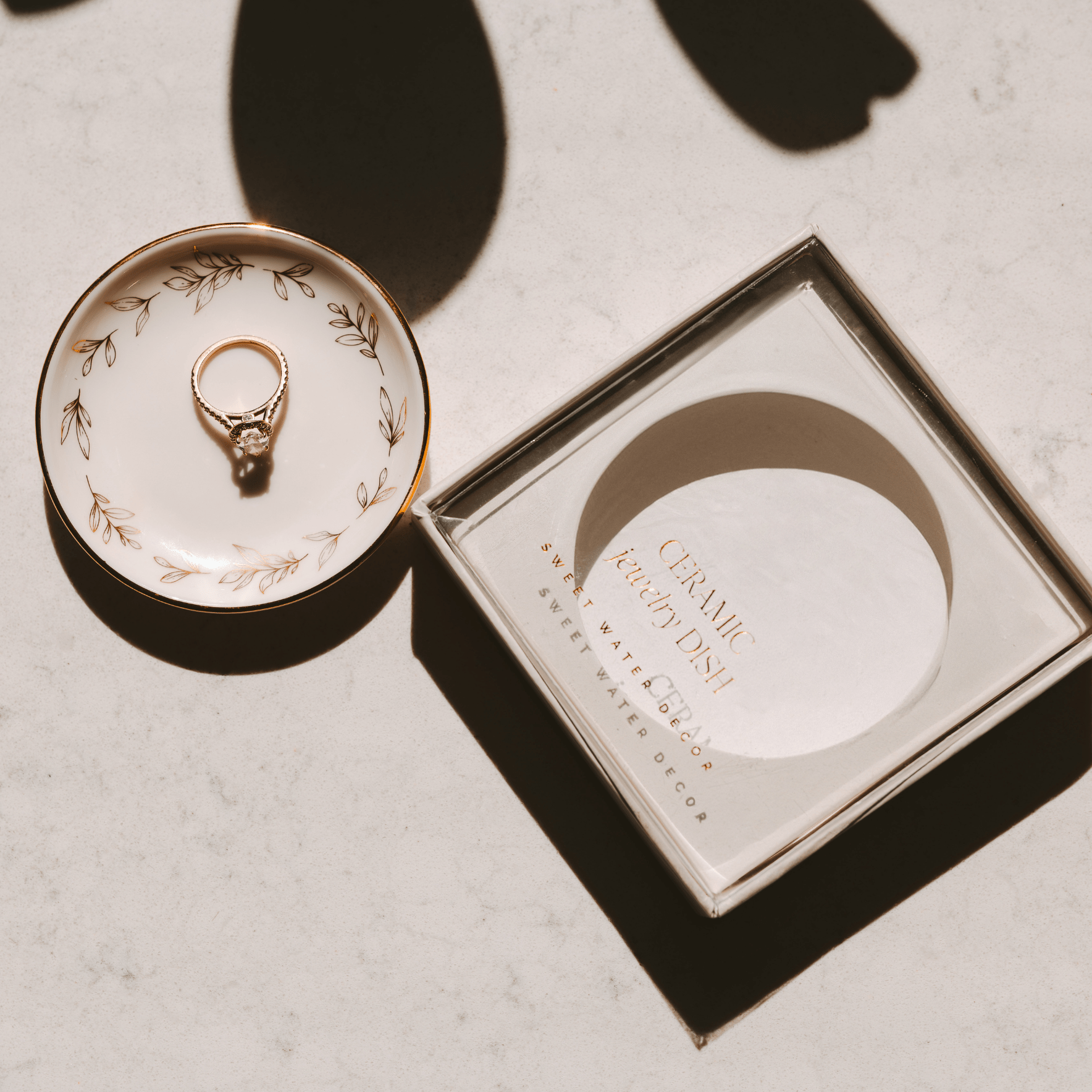 Keep your jewelry and cherished treasures elegantly organized with our Gold Leaves Jewelry Dish. This ceramic ring holder features delicate gold foil leaf detailing around the rim, adding a timeless touch of sophistication to your dresser, vanity, or nightstand. Perfect as a ring dish, small trinket tray, or catch-all for earrings and other delicate items, it combines beauty with everyday practicality.