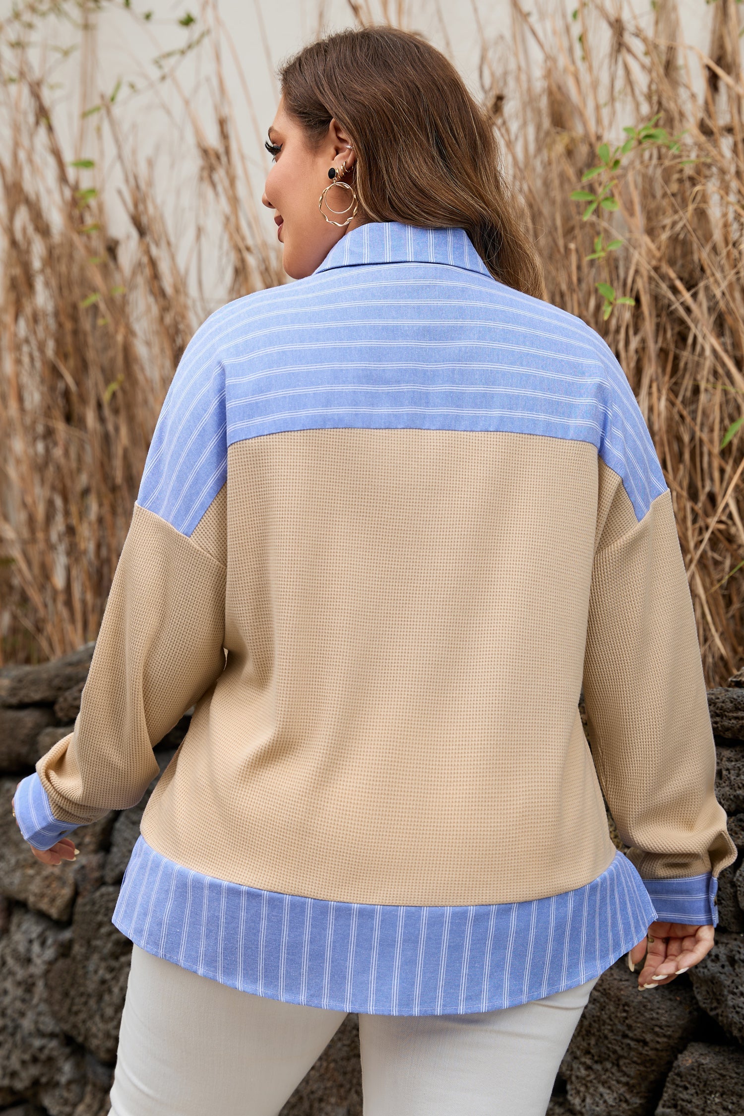 This plus-size top combines textural interest with thoughtful design details. The fabric pairs beautifully with contrast striped patchwork, while a collared split neckline and button accents add polish. Dropped shoulders create an effortlessly relaxed silhouette, complemented by buttoned cuffs and strategic side slits. The curved high-low hem elevates the casual aesthetic, making this piece versatile enough for layering or wearing solo. Perfect for those seeking comfort without compromising on style. Polyester/Cotton