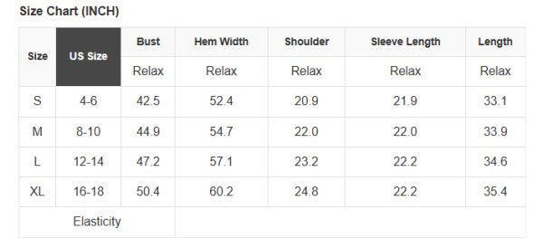 See size chart for approximate measurements.