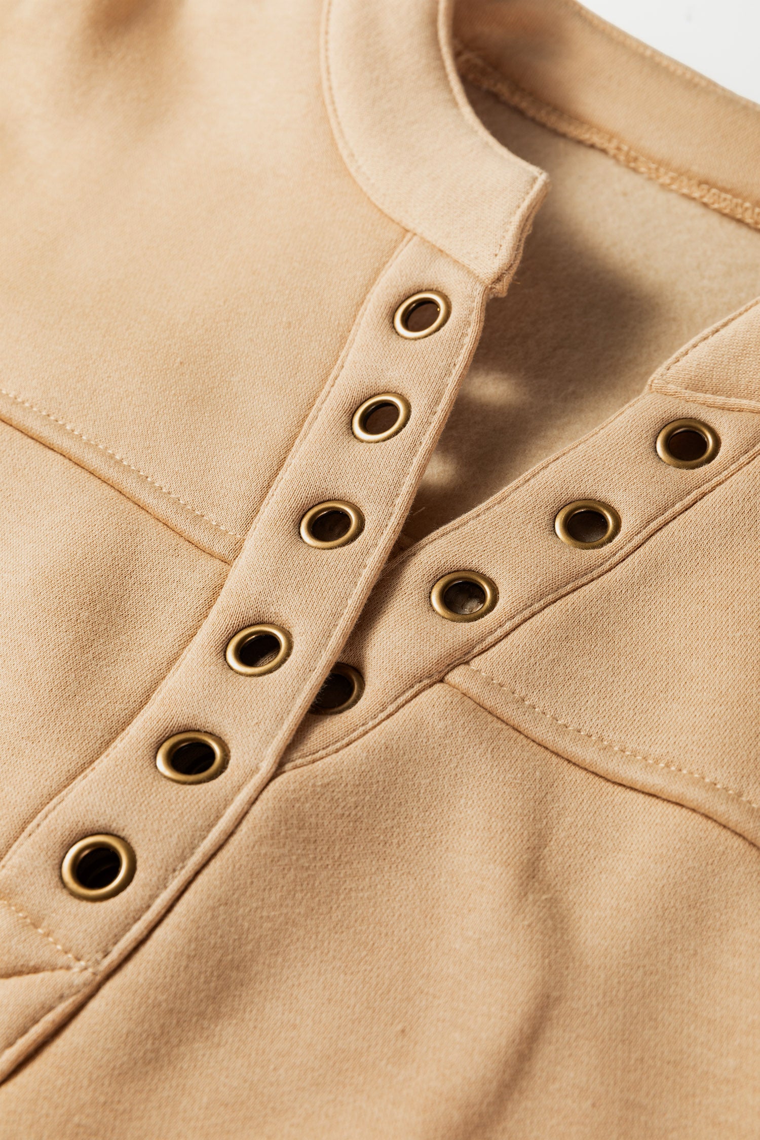 Elevate your basics with this understated sweatshirt that proves minimalism can still make a statement. The eye-catching grommet details at the V-neckline add just enough edge to keep things interesting, while the soft, neutral beige tone plays nicely with literally everything in your closet. Comfy enough for lazy days yet polished enough to layer into your everyday looks, this is the kind of versatile piece that becomes an instant favorite. Polyester/Cotton