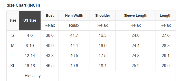 See size chart for approximate measurements.