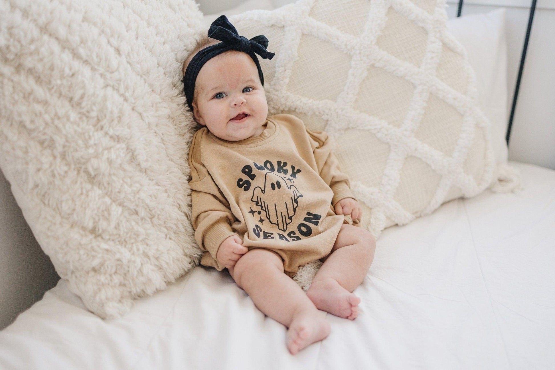 Gear up for the Spooky Season with our Graphic Oversized Sweatshirt Romper. This romper boasts convenient snaps at the crotch, ensuring effortless dressing and diaper changes.